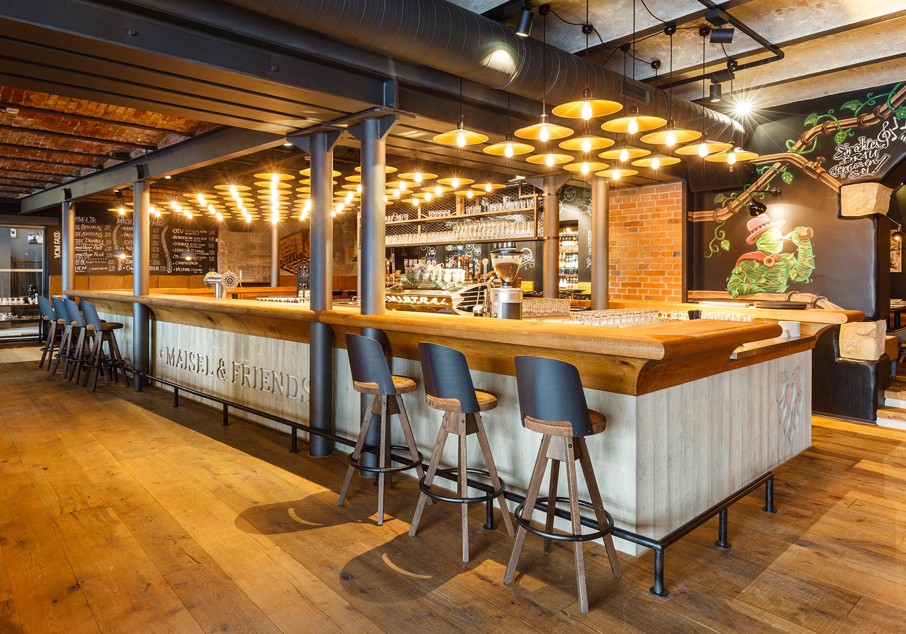 Con 21 llaves de cerveza de barril a lo largo de 25 metros de barra, este bar es el corazón del restaurante Liebesbier. Su base está compuesta de una superficie de concreto aparente con detalles y letras incorporadas. Un concreto especial de alto rendimiento de CEMEX se utilizó para lograr la textura y el acabado.
