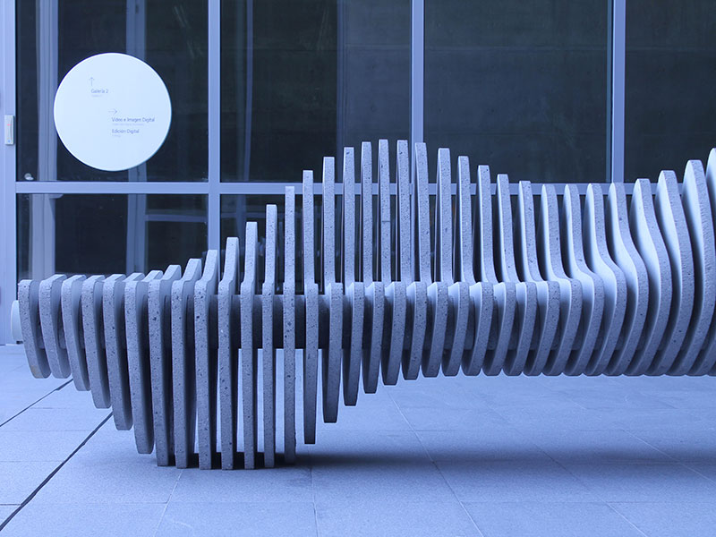 Para concebir su banca, el equipo tuvo la idea de crear 30 piezas molde, con distintas proporciones, que se repiten como en un espejo hasta crear una forma completa apoyada sobre dos ejes.