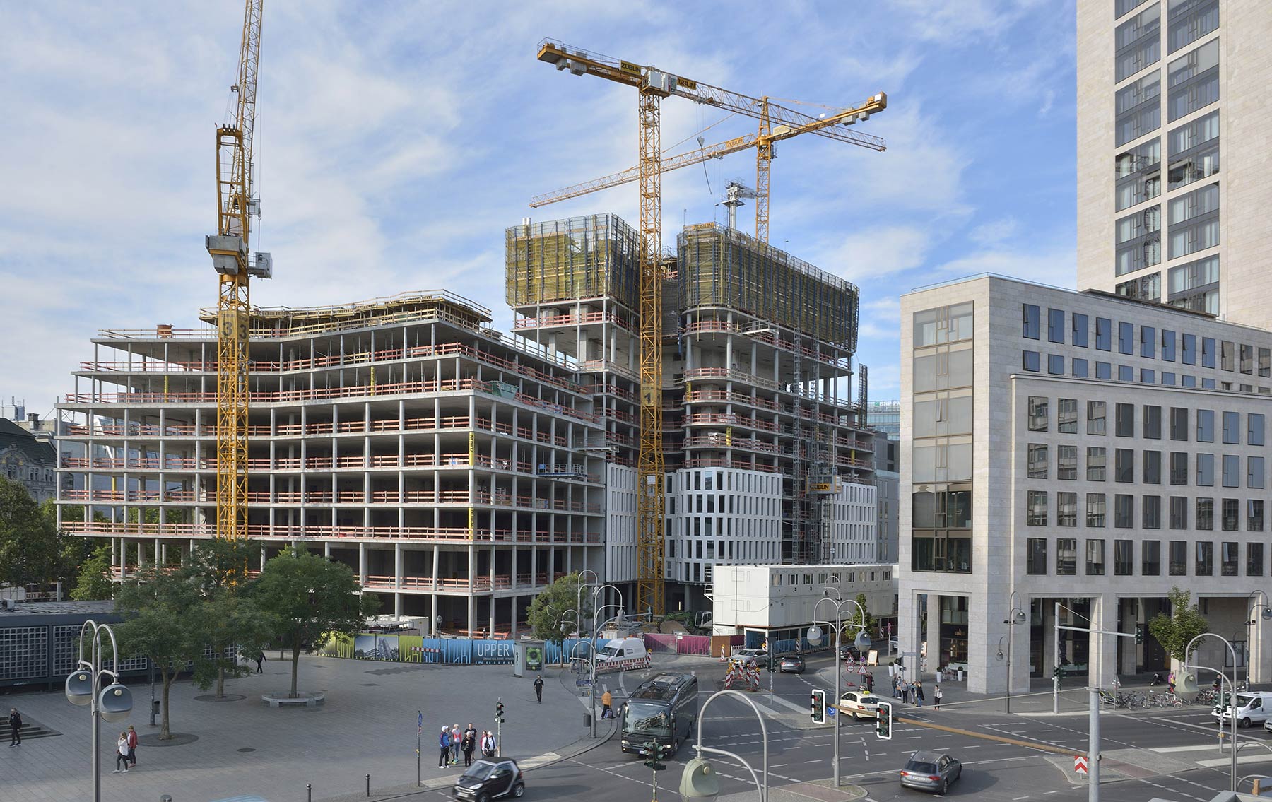 El colado se inició el verano de 2014 con la construcción de la capa de sub-base. Como cimiento para los futuros 34 pisos, la sección de la placa inferior necesitaba ser altamente reforzada, por lo que CEMEX proporcionó un concreto premezclado especial de alta resistencia. Manteniendo el ritmo de la programación del proyecto, 4.500 metros cúbicos de concreto premezclado se vertieron en un periodo de 36 horas bajo 16 metros de profundidad utilizando dos bombas de 52 metros. "Vertimos sin parar desde las 8 de la mañana hasta la tarde del día siguiente. La constructora solicitó una producción de hasta 130 metros cúbicos por hora", dice Torsten Schiller, Ejecutivo de Cuenta de CEMEX para la región de Berlín. Entre los materiales proporcionados, el cliente también seleccionó un concreto premezclado de CEMEX con una consistencia muy suave que sería fácil de procesar: un elemento esencial cuando se trabaja en un plazo de tiempo corto con volúmenes tan grandes.