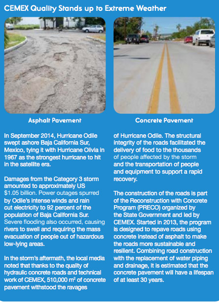 En el 2013 el gobierno estatal de Baja California Sur, en México, empezó a repavimentar varias carreteras de asfalto con concreto, como parte del Programa de Reconstrucción con Concreto (PRECO) dirigido por CEMEX. El siguiente año, el Huracán Odile, considerado el de mayor intensidad que se ha visto en la zona desde el año 1967, ocasionó graves inundaciones que obligaron a realizar evacuaciones masivas. Después de la tormenta, los medios de comunicación locales señalaron que gracias a la calidad de las carreteras de concreto hidráulico y al trabajo técnico de CEMEX, aproximadamente 510.000 m2 del pavimento de concreto resistieron los estragos del huracán. Esa integridad estructural facilitó la labor de distribución de alimentos y la llegada de personas y equipos de apoyo, que hicieron posible una rápida recuperación para las miles de personas afectadas.